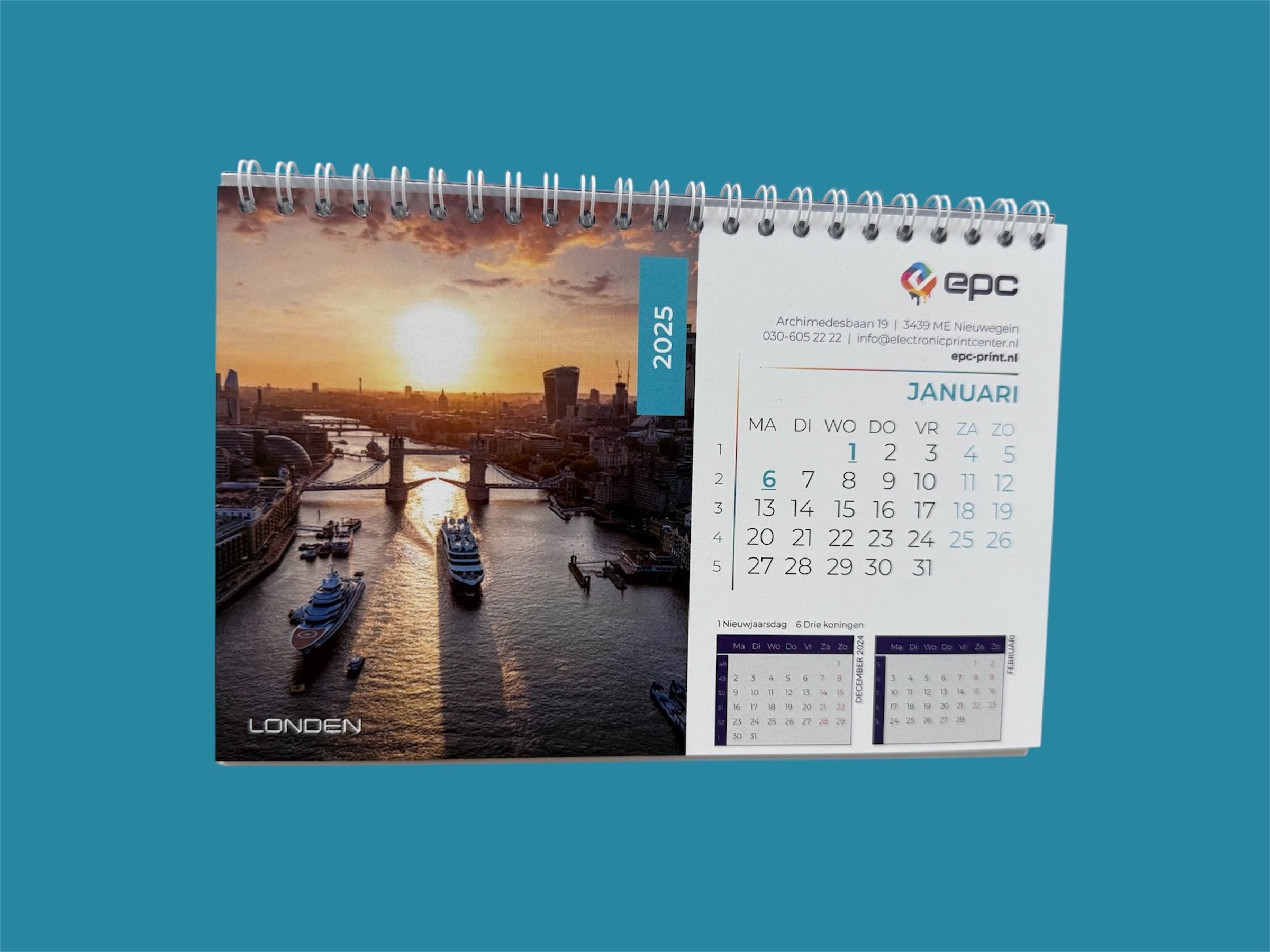 Een bureaukalender ook wel tafelkalender genoemd is niet alleen praktisch, maar ook een stijlvolle toevoeging aan elk bureau. Bij EPC Nieuwegein printen en drukken we bureaukalenders in vele verschillende uitvoeringen van hoge kwaliteit. Of het nu gaat om gepersonaliseerde ontwerpen of professionele branding, wij maken jouw bureaukalenders precies zoals uw ze wilt.